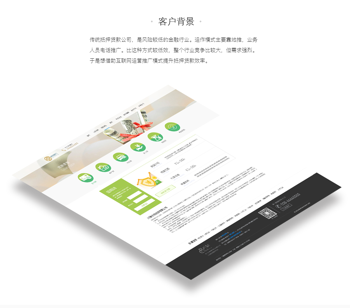 传统抵押贷款公司,是风险较低的金融行业。运作模式主要靠地推,业务人员电话推广。比较低效,整个行业竞争比较大,但需求强烈。