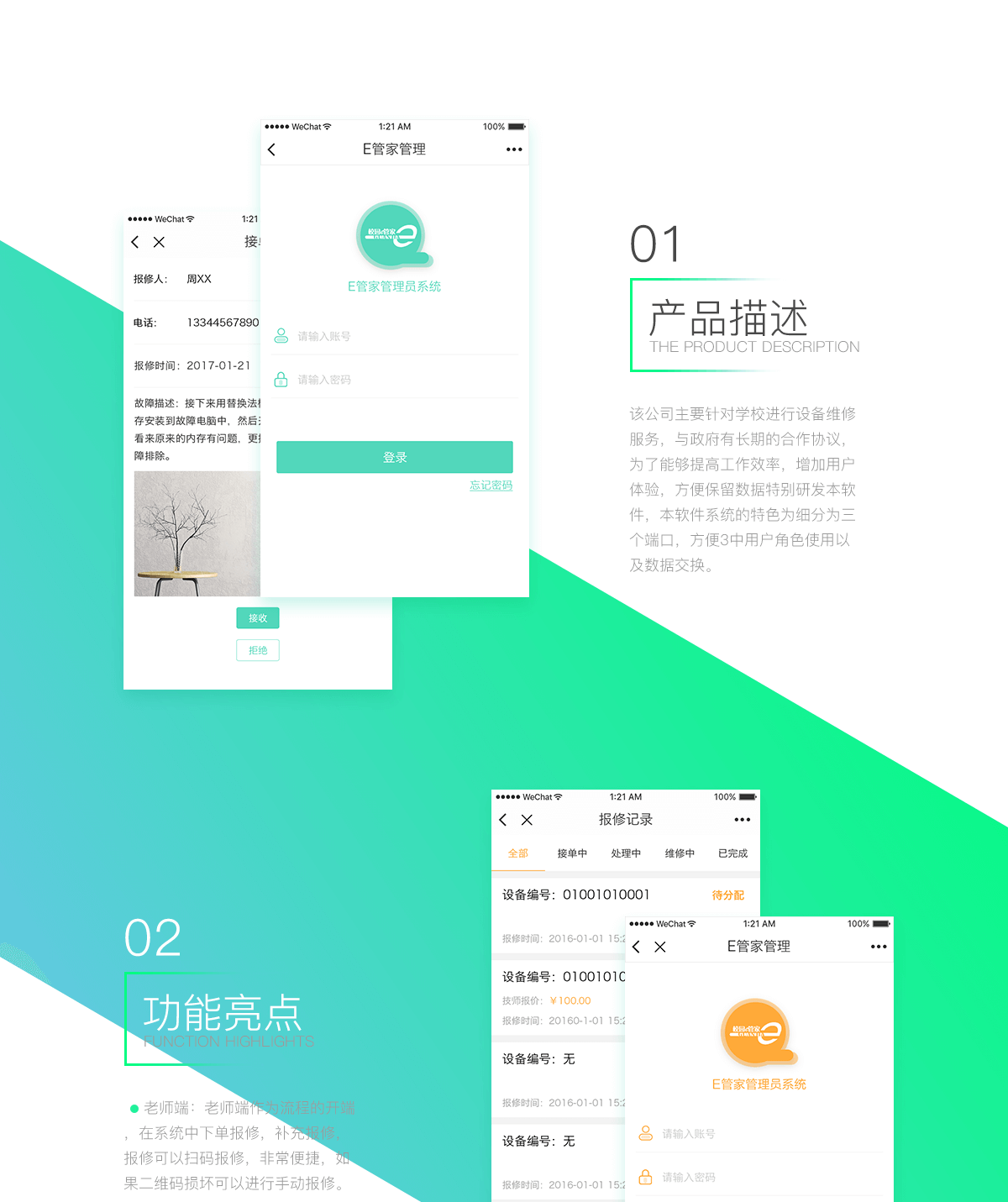 该公司主要针对学校进行设备维修服务,与政府有长期的合作协议,为了能够提高工作效率,增加用户体验,方便保留数据特别研发本软件,本软件系统的特色为细分为三个端口,方便3中用户角色使用以及数据交换。