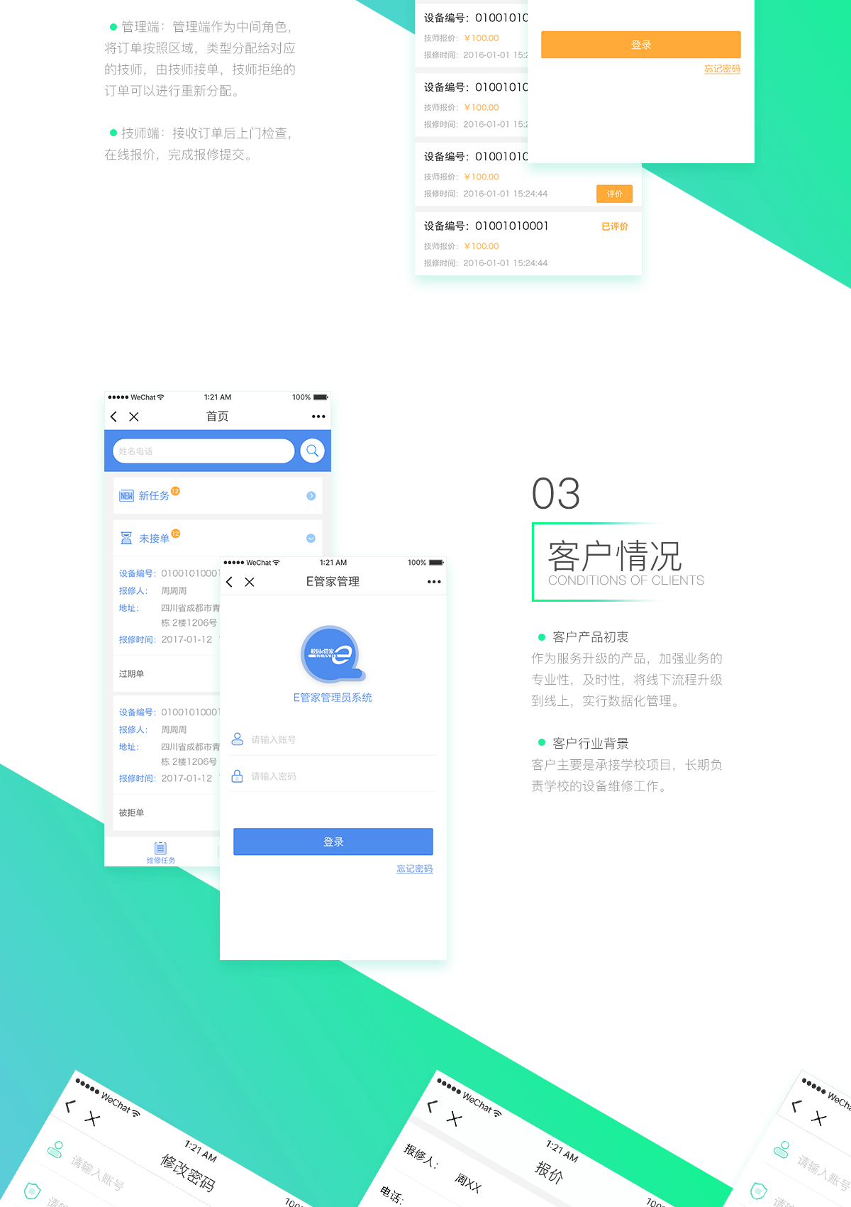 管理端:管理端作为中间角色,将订单按照区域,类型分配给对应的技师,由技师接单,技师拒绝的订单可以进行重新分配。