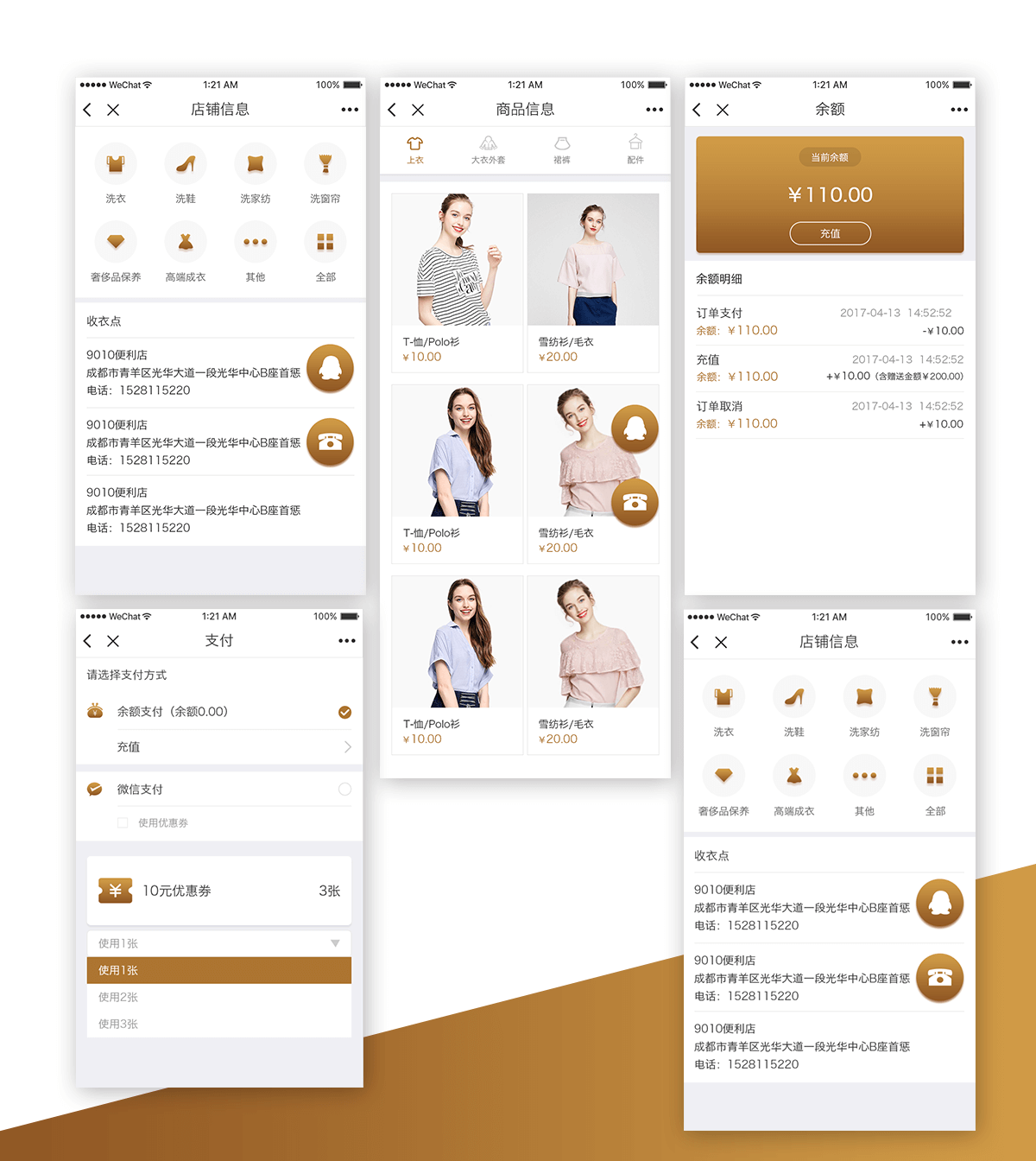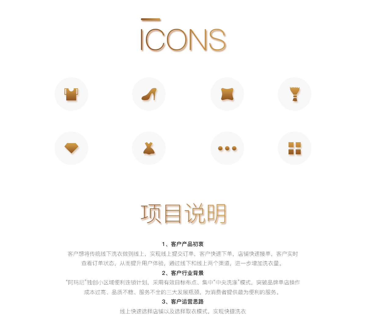 本产品为一款在线预约洗衣的小程序。客户通过在线选择离自己比较近的店铺下单需要洗的衣服,并可以自由选择店铺上门收衣或自己将衣服送至选定收衣点。并实时跟踪洗衣情况。