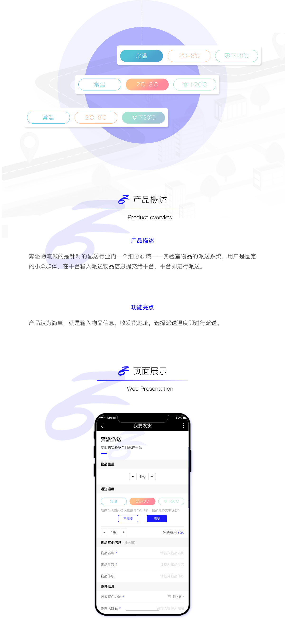 产品较为简单,就是输入物品信息,收发货地址,选择派送温度即进行派送。