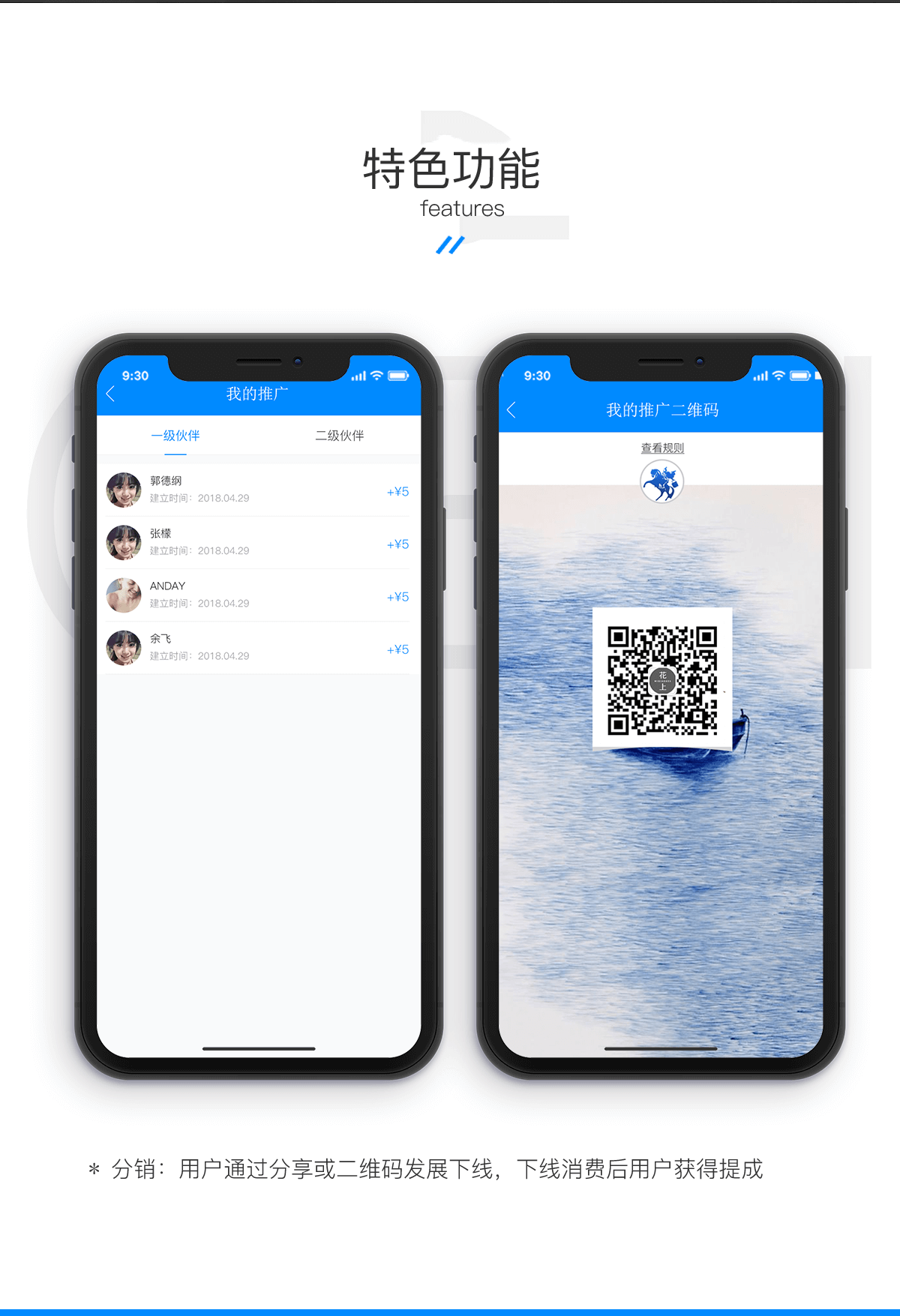 分销:用户通过分享或二维码发展下线,下线消费后用户获得提成