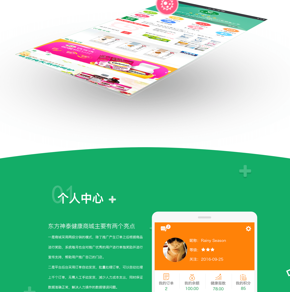 成都公众号健康商城是以“B2B2C“为商业模式的线上综合性健康商城,商城通过统一的经营管理对商品和服务、消费终端同时进行整合,定制、监督、检验产品,为消费者提供高品质健康产品。商城通过代理产品是销售渠道建立推广团队,通过用户自身的推广宣传自己的产品,同时利用线下门店优势为平台宣传造势。平台通过微信这一传播渠道做商城活动,引流用户线下消费体验。