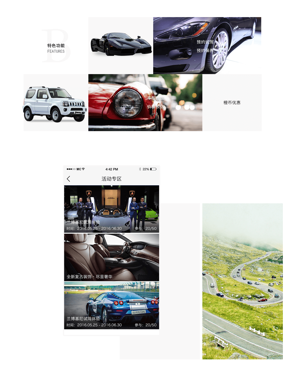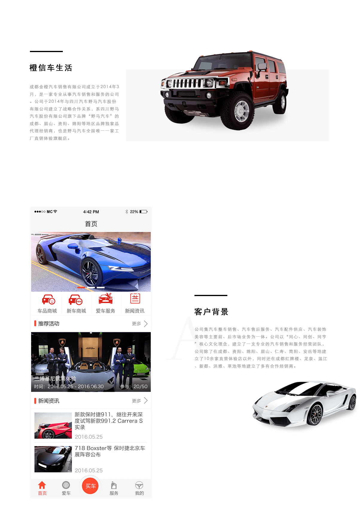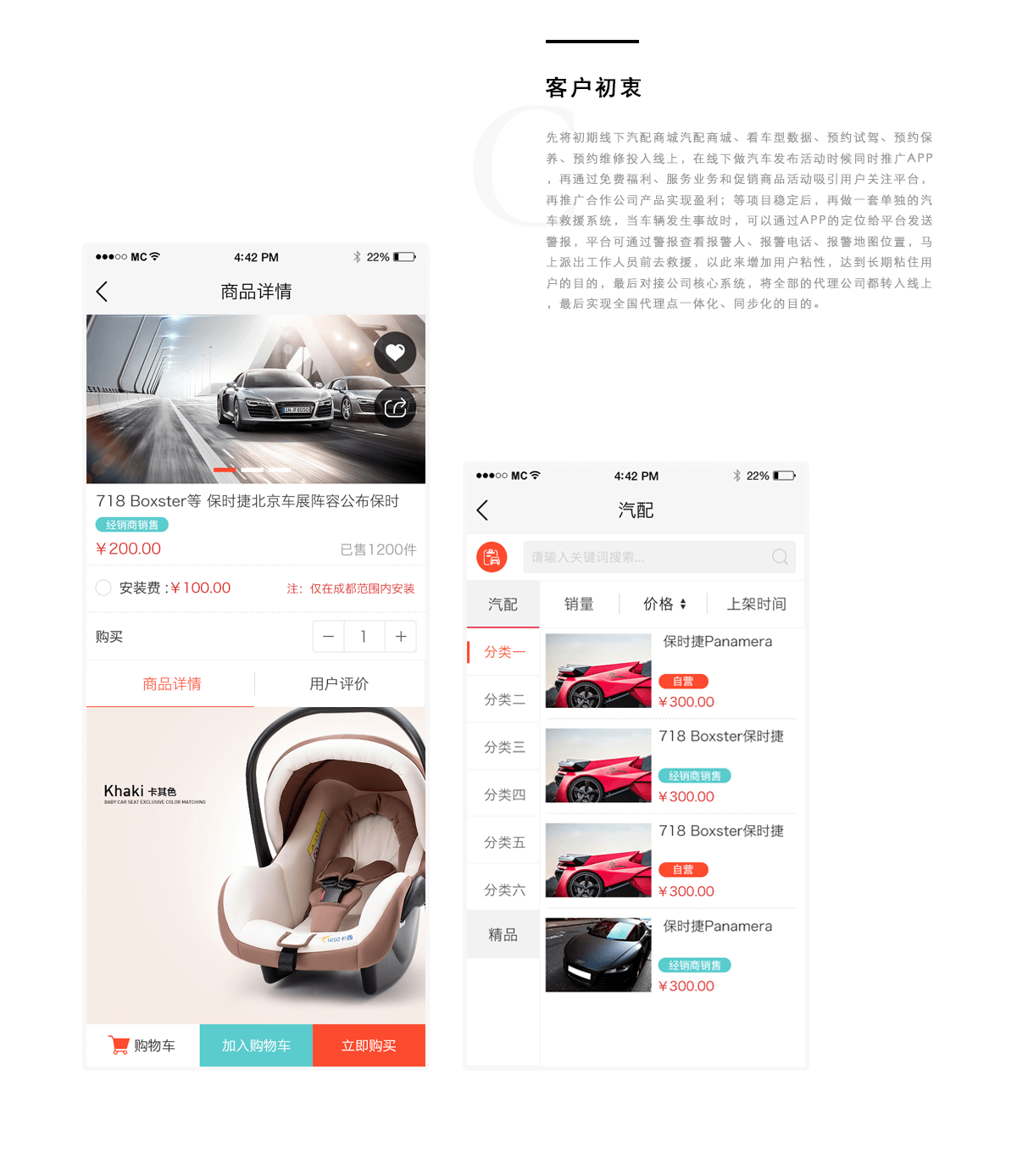 集汽配商城、看车型数据、预约试驾、预约保养、预约维修于一身的综合APP;汽配商城为二级分类普通商城;看车型数据可以分品牌、车系、车型,并且可以价格、预约试驾、二手车价格预估、分期购买价格预估;预约保养和预约维修可选择品牌、车系、车型然后选择最近的保养店、维修店,再选择时间进行服务,保养时,可以使用平台发放的优惠币进行优惠。
