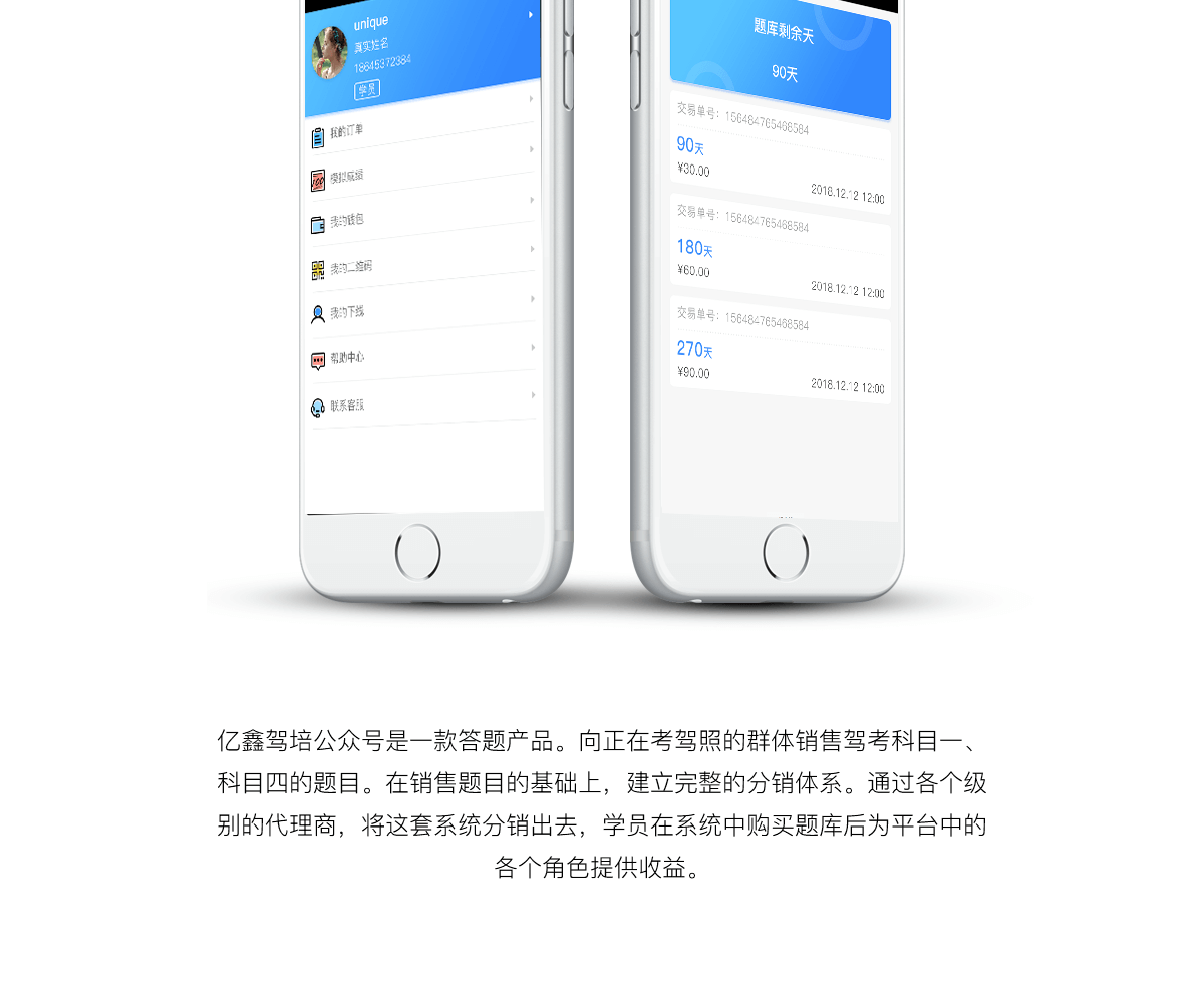 亿鑫驾培公众号是一款答题产品。向正在考驾照的群体销售驾考科目一、科目四的题目。在销售题目的基础上,建立完整的分销体系。通过各个级别的代理商,将这套系统分销出去,学员在系统中购买题库后为平台中的各个角色提供收益。