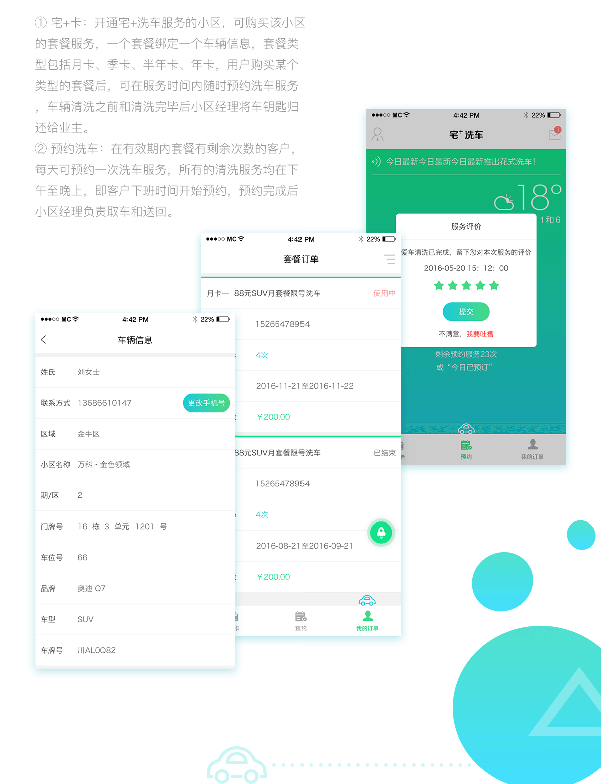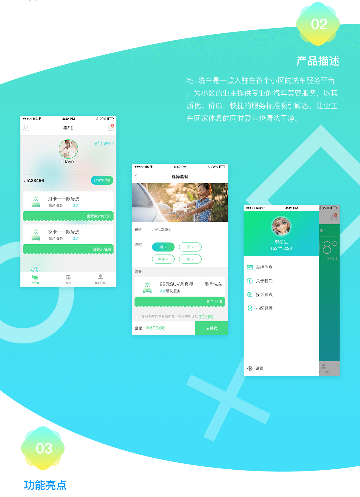 宅+卡:开通宅+洗车服务的小区,可购买该小区的套餐服务,一个套餐绑定一个车辆信息,套餐类型包括月卡、季卡、半年卡、年卡,用户购买某个类型的套餐后,可在服务时间内随时预约洗车服务,车辆清洗之前和清洗完毕后小区经理将车钥匙归还给业主。