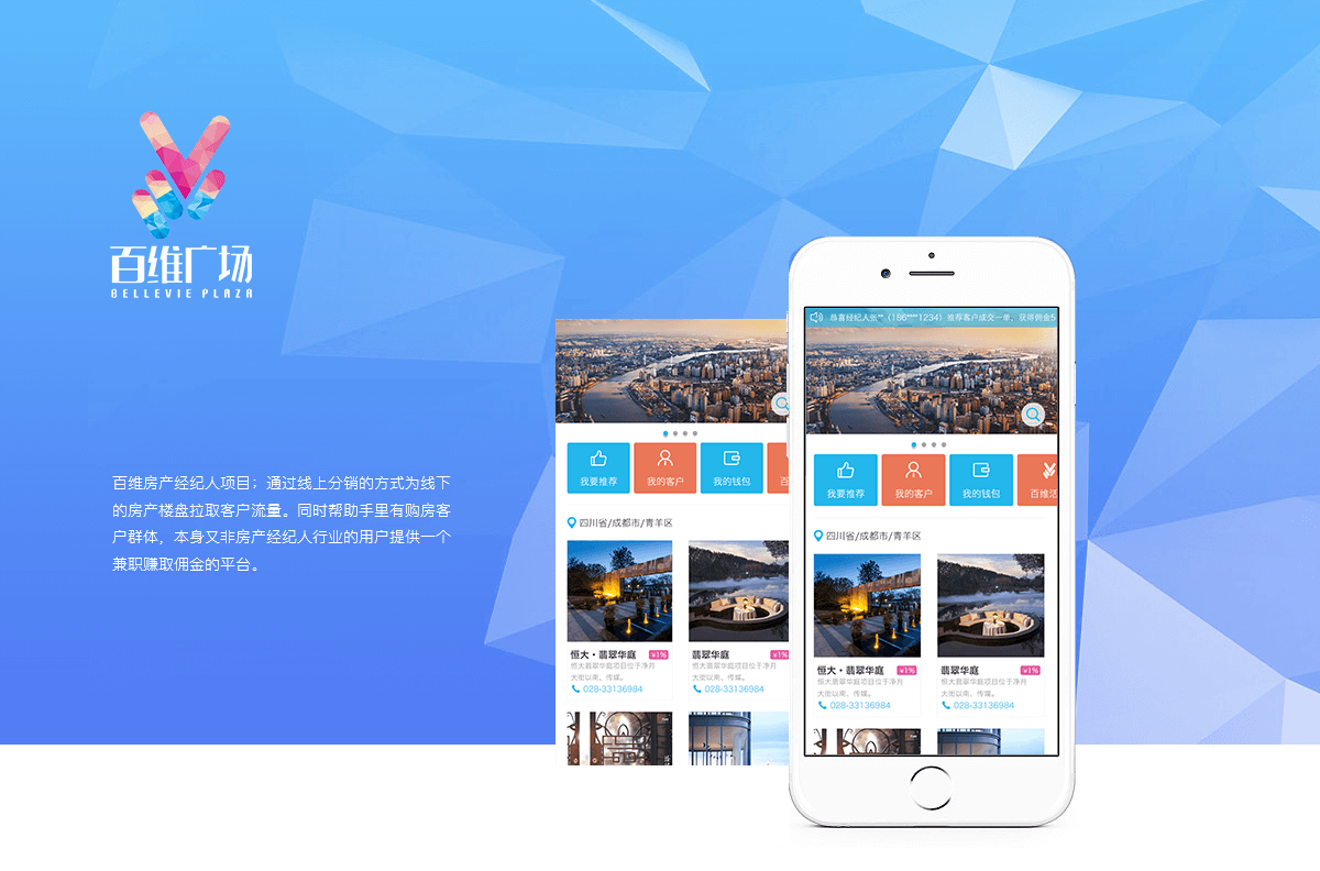 百维房产经纪人项目;通过线上分销的方式为线下的房产楼盘拉取客户流量。同时帮助手里有购房客户群体,本身又非房产经纪人行业的用户提供一个兼职赚取佣金的平台。