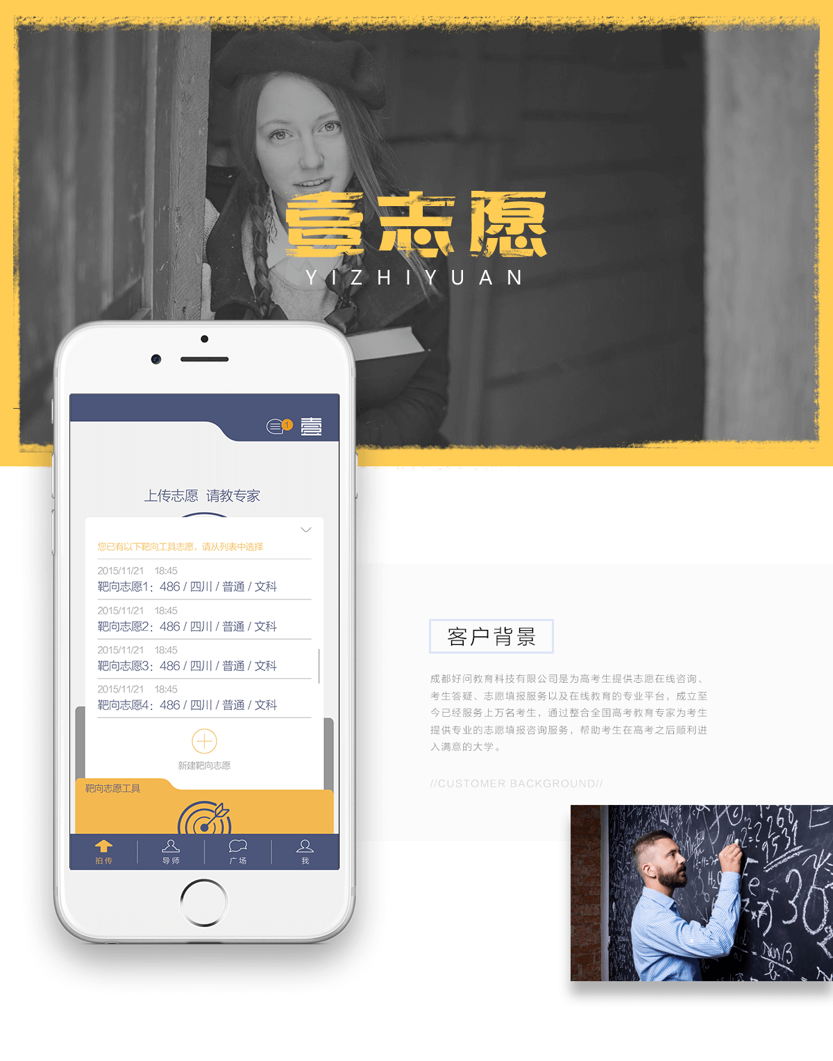 壹志愿APP通过为考生提供志愿填报以及在线教育辅导,提供精准的靶向志愿、导师在线诊断志愿、学生论坛交流、社区自由请教、1对1辅导等业务,真正帮助高考学生和家长答疑解惑,也为相关领域的专家导师利用碎片化的时间分享价值,创造利益。