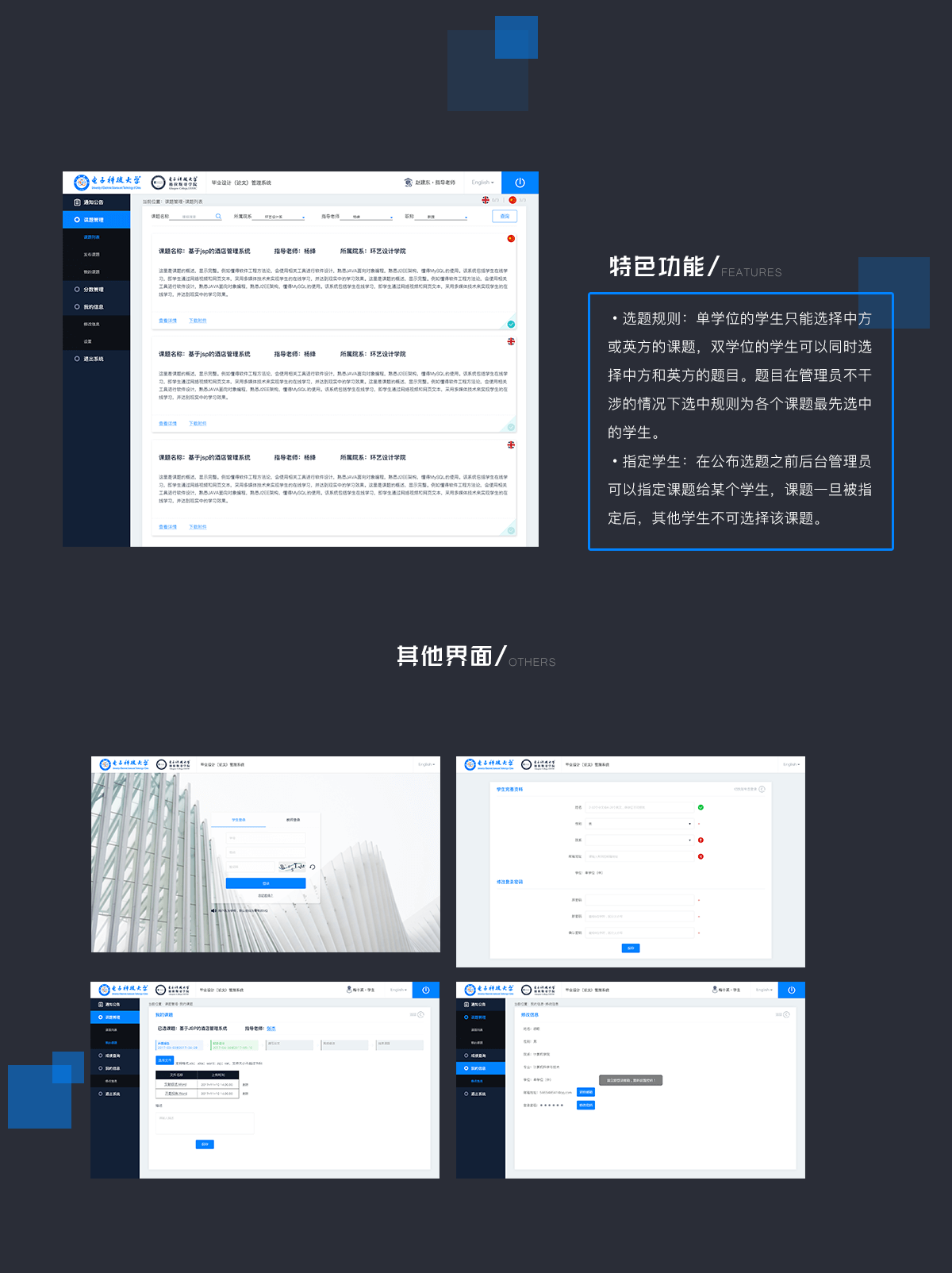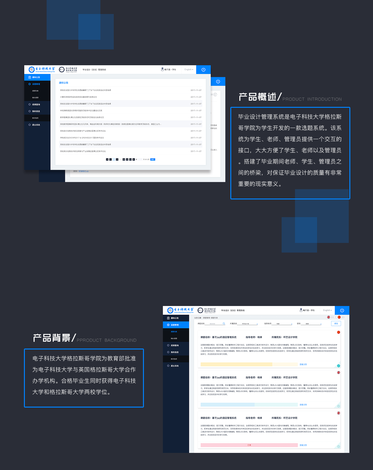 一款电子科技大学国际学院为学生开发的选题系统。搭建毕业期间老师、学生、管理员之间的桥梁,保证毕业设计的质量