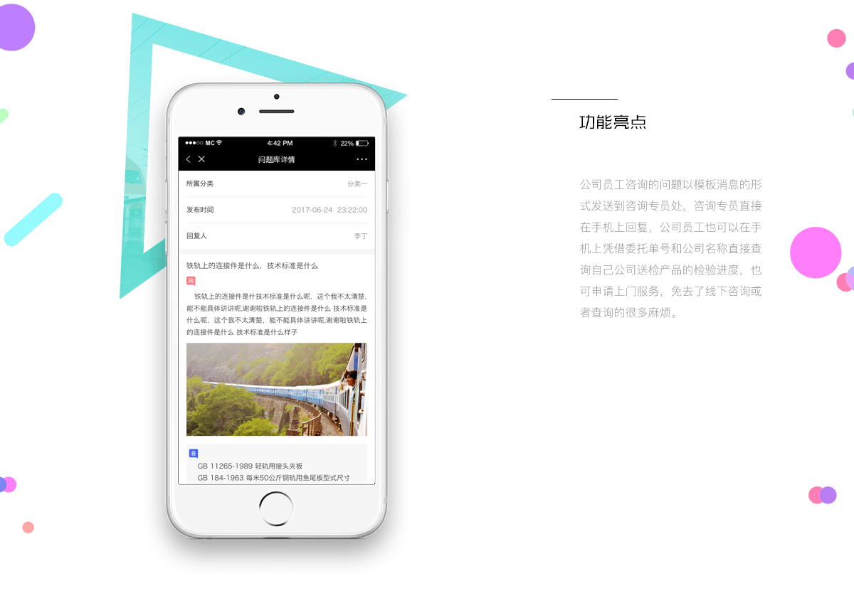 成铁计量局微信公众号是一款供企业员工依照委托单号和公司名称查询自己公司送检产品的检验进度公众号,致力于为企业员工提供免费的咨询查询平台;查询送检产品进度、咨询问题、提建议和意见、在线预定等。铁路局的咨询专员在微信公众号上面接收其他公司员工提出的问题(模板消息形式发送),并直接回复。